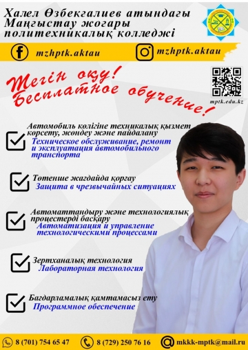 2023-2024 оқу жылына Халел Өзбекғалиев атындағы Маңғыстау жоғары политехникалық колледжі 9-11 сынып оқушыларын ТЕГІН ОҚУҒА қабылдаймыз! 9-сыныптан кейін 11 мамандық...