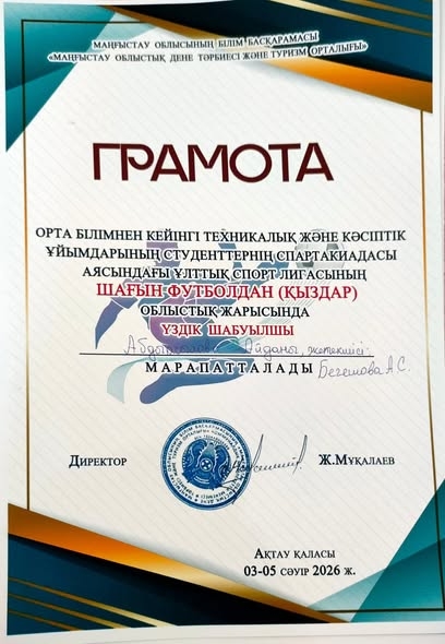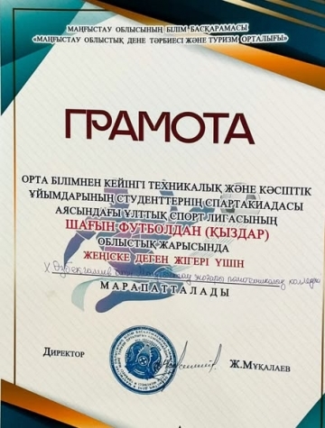 Орта білімнен кейінгі техникалық және кәсіптік ұйымдарының студенттерінің спартакиадасы аясында ұлттық лигасының қыздар арасындағы шағын футболдан облыстық жарысында жеңіске деген жігері үшін Грамотасымен марапатталды;